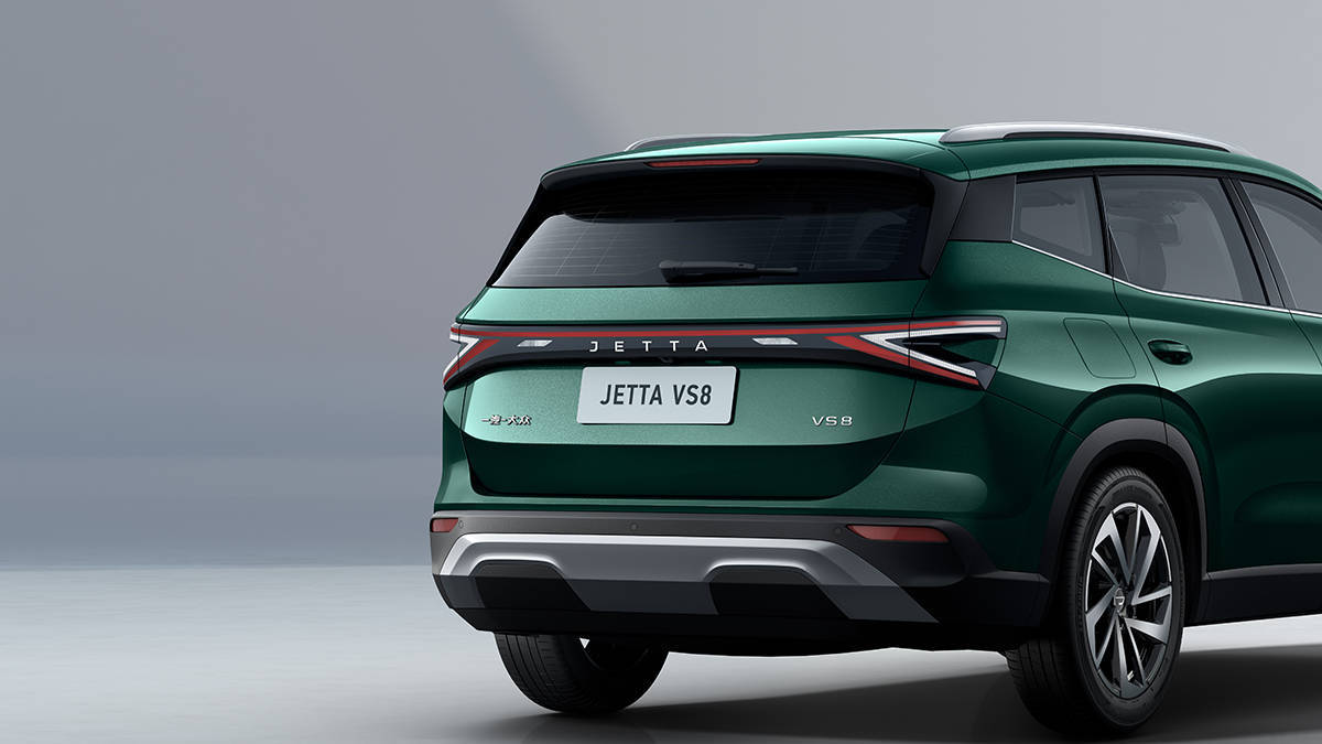 捷达VS8的外观设计极具辨识度,格栅上方贯穿式的LED灯带与前大灯组内的V字形日间行车灯巧妙相连,品牌LOGO也可点亮,整体造型时尚且富有科技感。车身尺寸为长4629mm、宽1851mm、高1624mm,轴距达到2731mm,车身轮廓圆润饱满,符合家用车的定位。D柱采用贴黑处理,营造出悬浮式车顶的视觉效果,车尾小窗面积较大,增添了车辆的时尚气息。